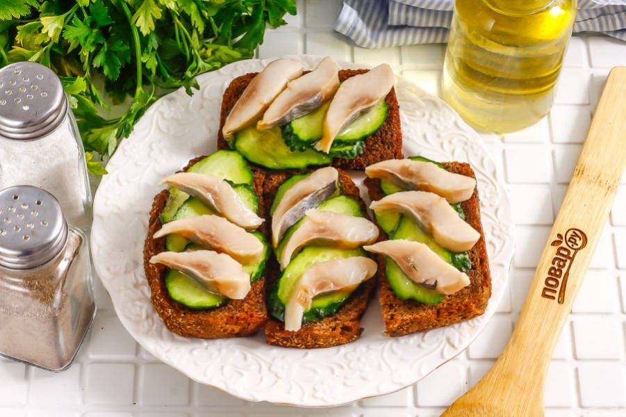 Выложите ломтики сельди на огурцы. Сверху можете полить селедочным маслом, если приобретали сельдь в пресерве. Ни майонез, ни сметану использовать не нужно.