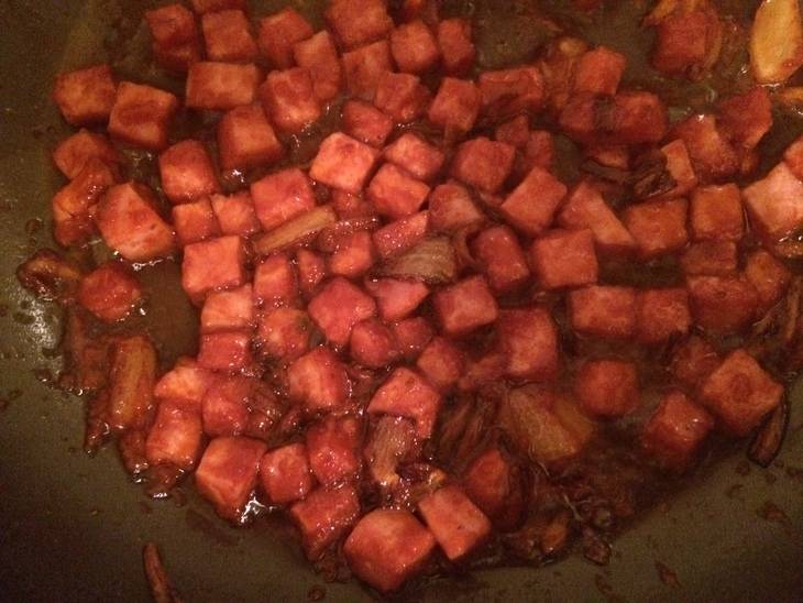 Мелко нарезаем лук и ветчину. Обжариваем на сковородке.