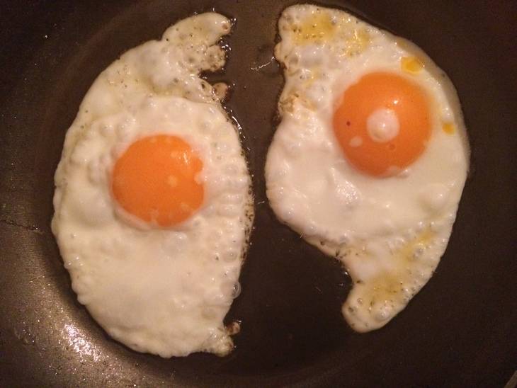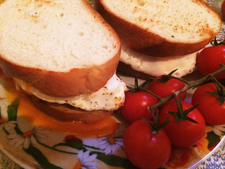 Делаем две яичницы, которые накладываем на батоны.