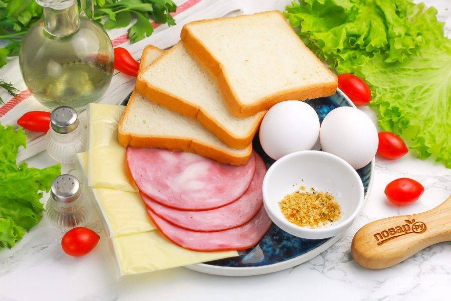 Подготовьте указанные продукты. Приобретите нарезку ветчины и плавленный сыр в квадратиках (порционный). Хлеб лучше всего использовать тостовый — он идеальной формы и уже нарезан.