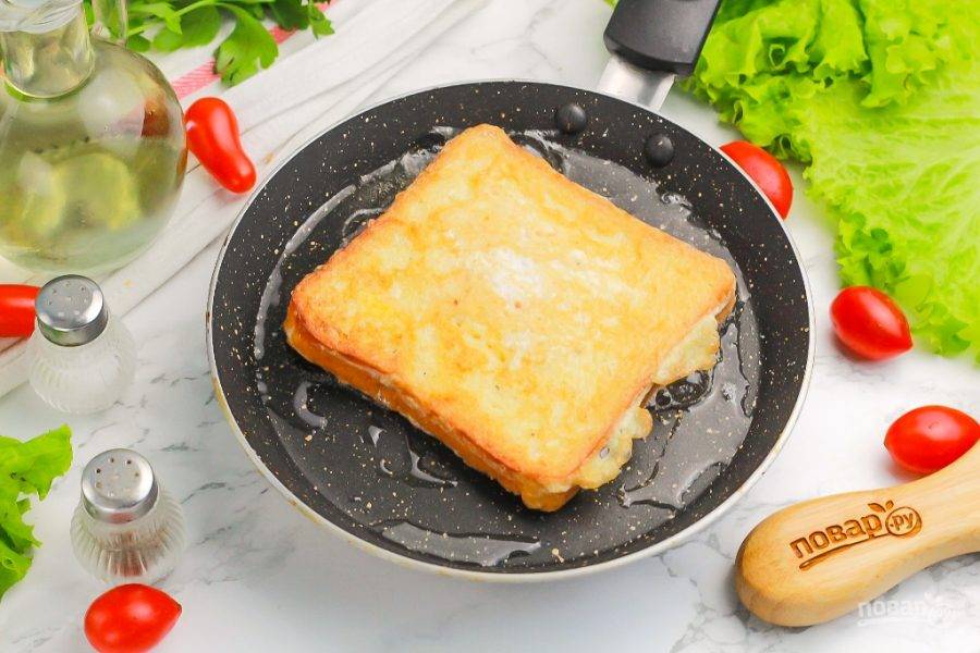 Прогрейте половину растительного масла на сковороде и выложите в него хлеб. Обжарьте на умеренном нагреве 1-2 минуты и переверните на другую сторону. После переворачивая обмакните в яичную смесь новый ломтик хлеба.