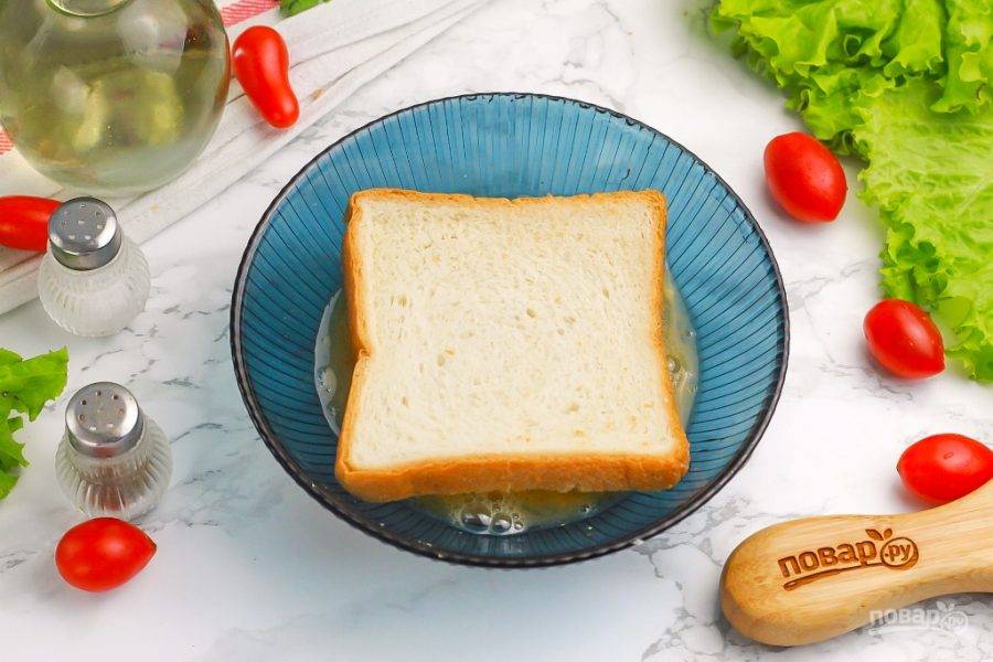 Выложите в емкость ломтик тостового хлеба и обмакните со всех сторон. Далее вы точно так же будете поступать с ломтиками хлеба, но обжаривайте их по одному.