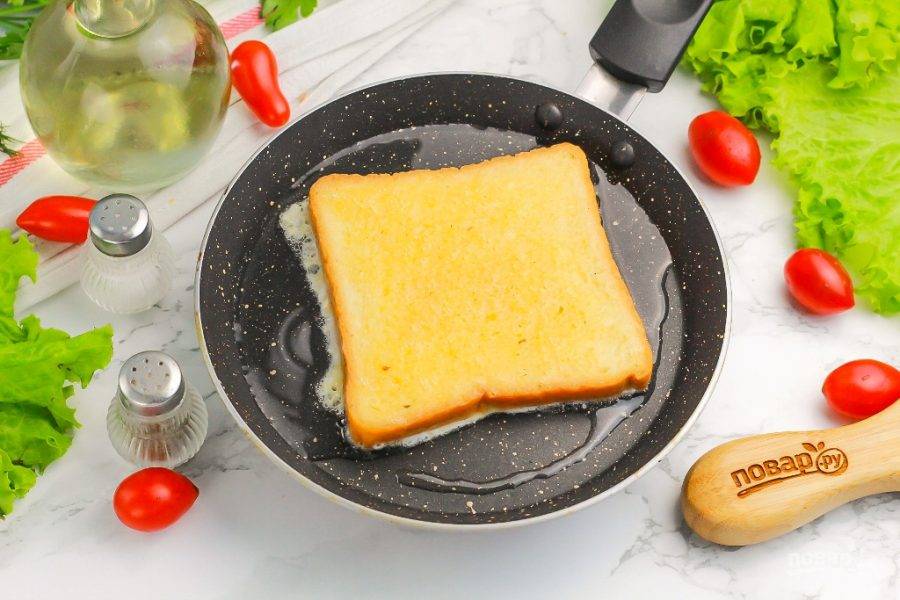 Поджарьте на другой стороне хлеб еще 1-2 минуты и выложите на тарелку. Таким же образом обжарьте и остальные ломтики.