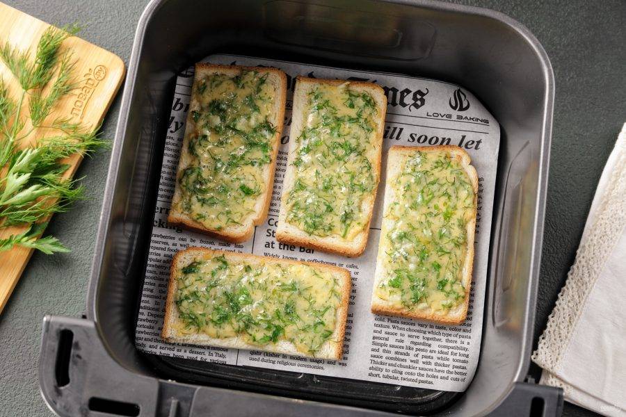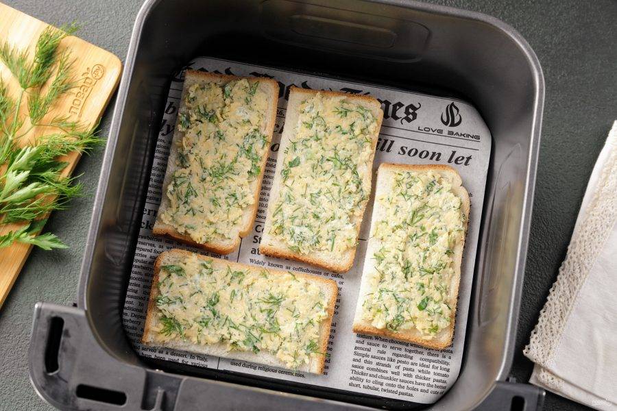 Если у вас чаша аэрогриля позволяет добавить одновременно два ломтика тостового хлеба, то это идеально. Я разрезала хлеб пополам, чтобы кусочки не соприкасались между собой.