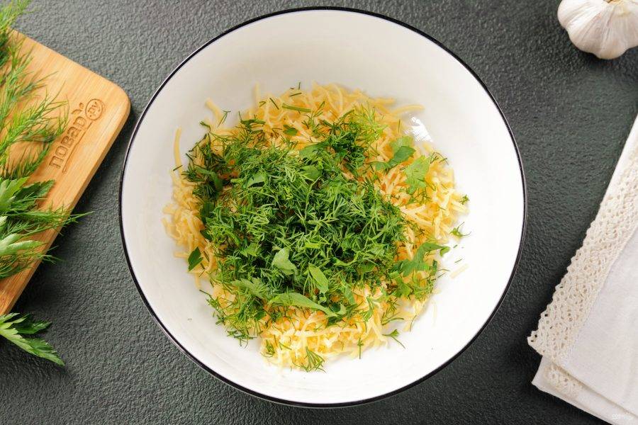Сыр натрите на мелкой тёрке и переложите в глубокую миску.