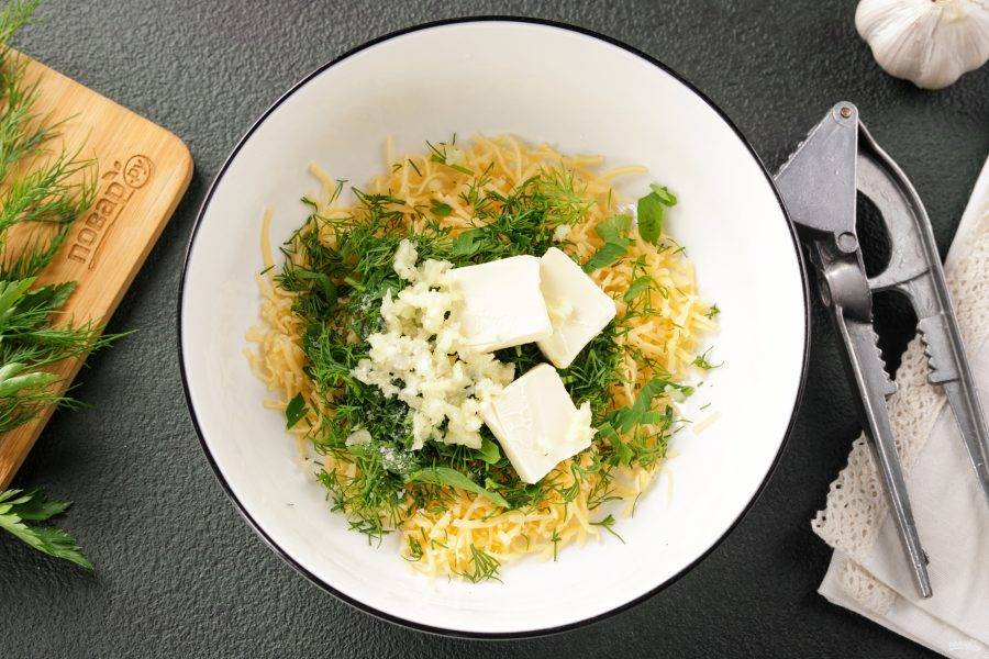 Выдавите пару зубчиков чеснока и добавьте мягкое сливочное масло. Масло должно предварительно полежать немного при комнатной температуре. Если у вас сыр не достаточно солёный, то можно дополнительно добавить маленькую щепотку соли.