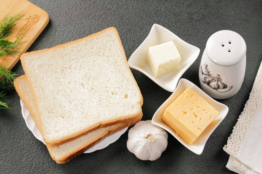 Подготовьте все ингредиенты по списку. Хлеб берите тот, что вам нравится, у меня сегодня тостовый. Сыр подойдёт любой, который хорошо плавится. Из зелени у меня сегодня петрушка и укроп.