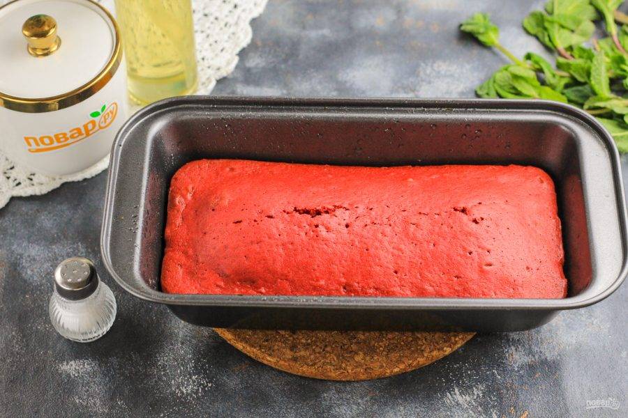 Разогрейте духовку до 160 градусов и поместите формы на средний яру. Выпекайте примерно 25-30 минут. Если печете все тесто в одной форме, то выпекайте примерно 45-50 минут и проверяйте деревянной шпажкой. Пока выпекаются коржи, извлеките сливочное масло из холодильника, чтобы оно стало мягким.