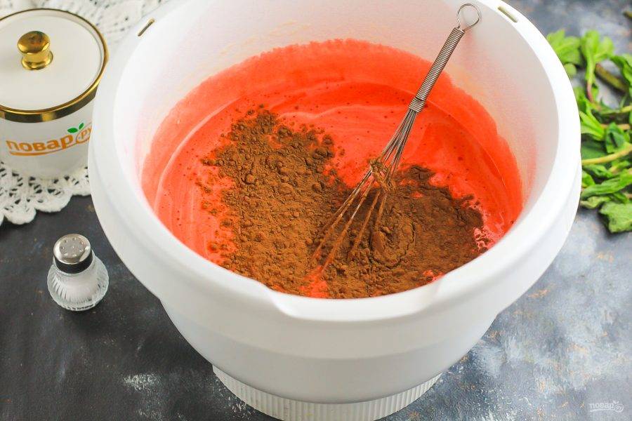 Влейте красочную массу во взбитые яйца, всыпьте какао-порошок. Он добавляется для того, чтобы красный цвет теста стал более насыщенным и не выгорел в процессе выпекания. Далее введите муку и разрыхлитель.