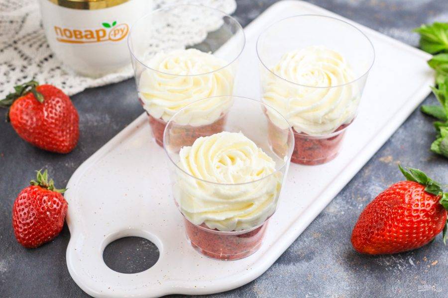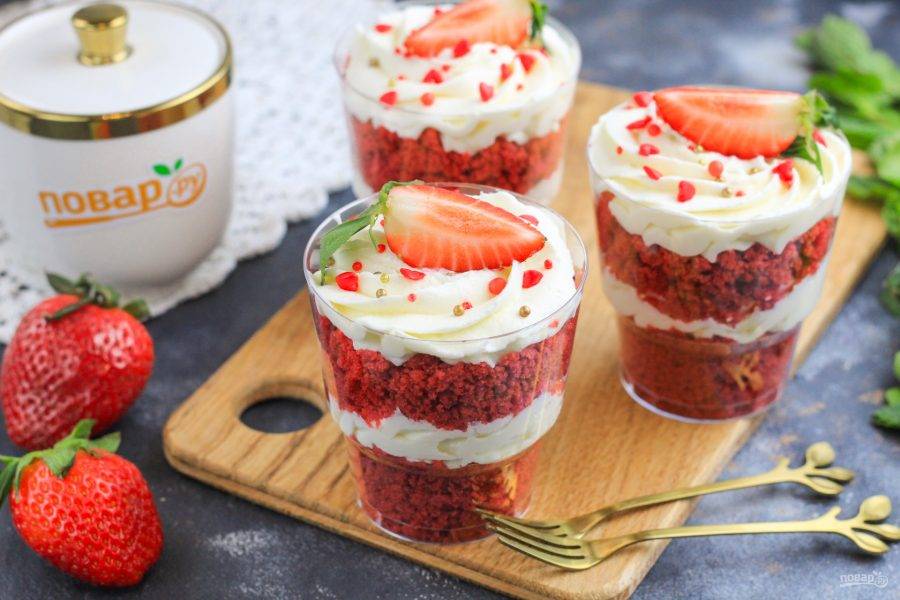 Затем снова выложите крошку и отсадите крем сверху. Украсьте трайфлы "Красный Бархат" присыпкой или свежими ягодами, поместите их в холодильник для пропитки минимум на полчаса.