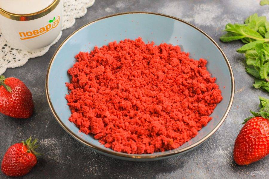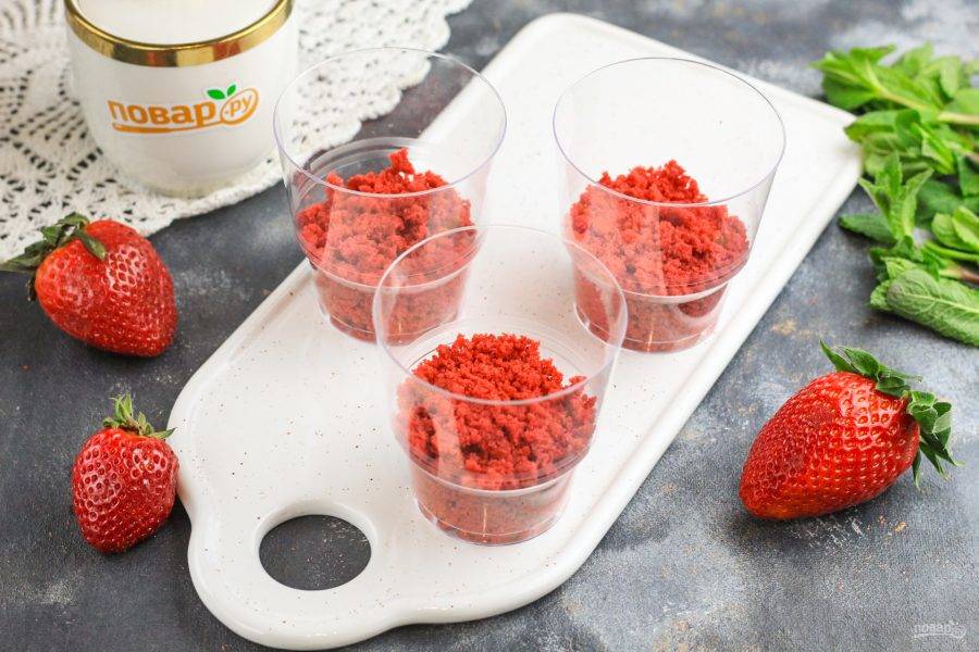На дно стаканов или чашек высыпьте часть красной бархатной крошки. По желанию можете пропитать ее любым сиропом.