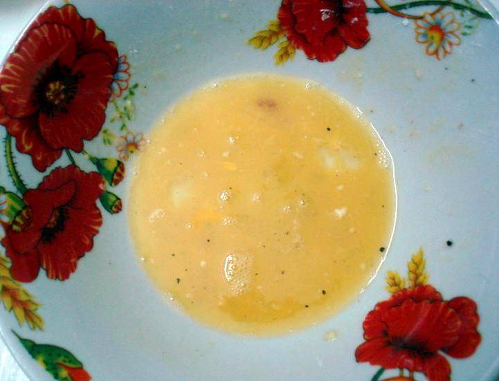 Далее разбиваем в миску яйцо, солим его немного и взбиваем вилкой до однородного состояния.