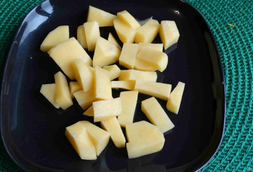Далее приступаем к подготовке овощей. Картофель очищаем от кожуры, моем, режем брусочками.
