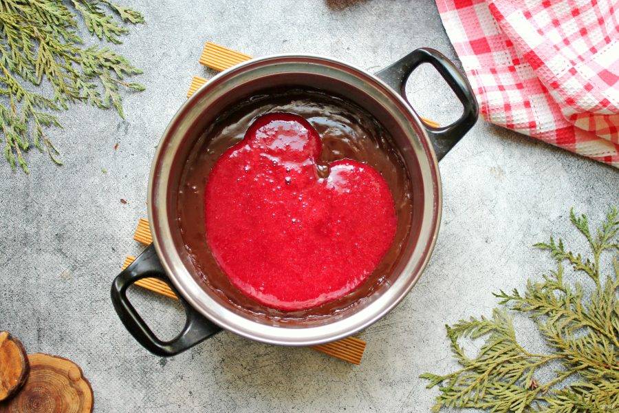 В шоколадную массу влейте малиновое пюре и тщательно перемешайте до однородной массы. Оставьте остывать при комнатной температуре на один час, перемешивая 2-3 раза в одном направлении.