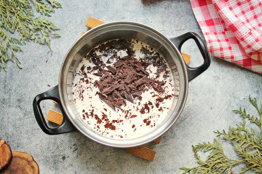Темный шоколад измельчите и залейте горячими, но не кипячеными сливками. Влейте коньяк и перемешайте до однородной шоколадной массы.