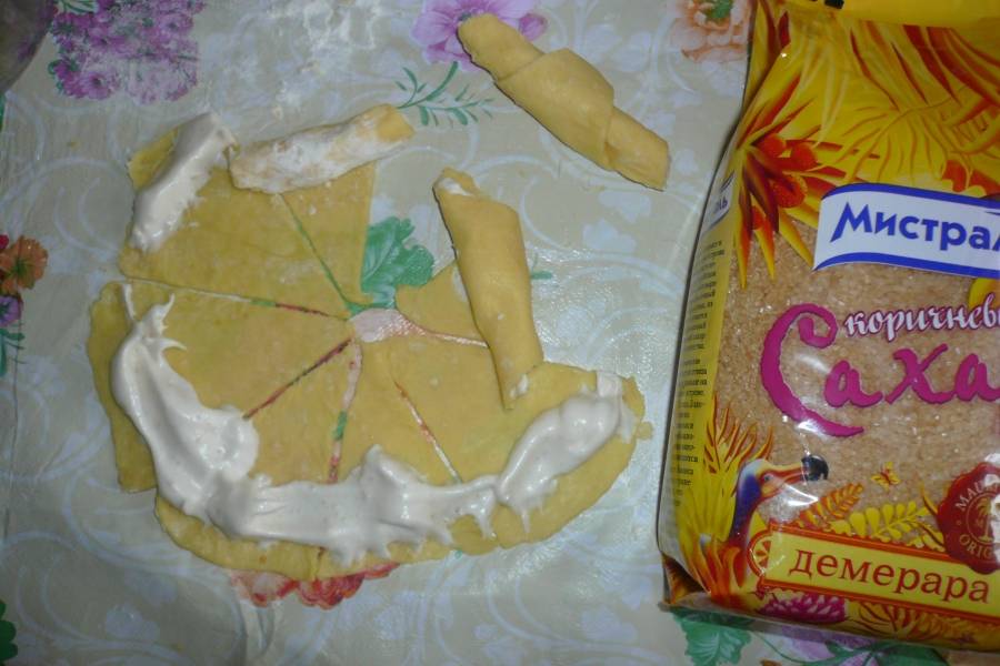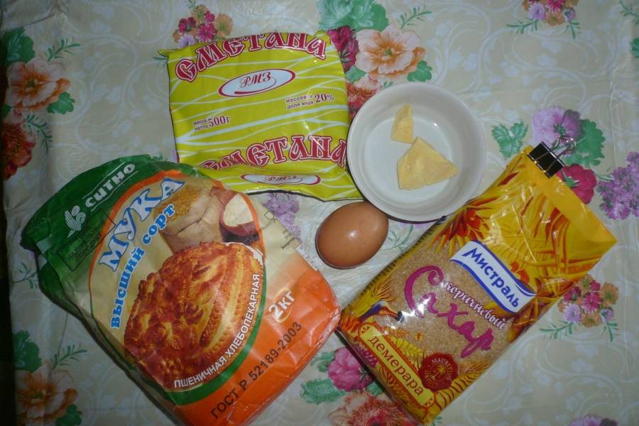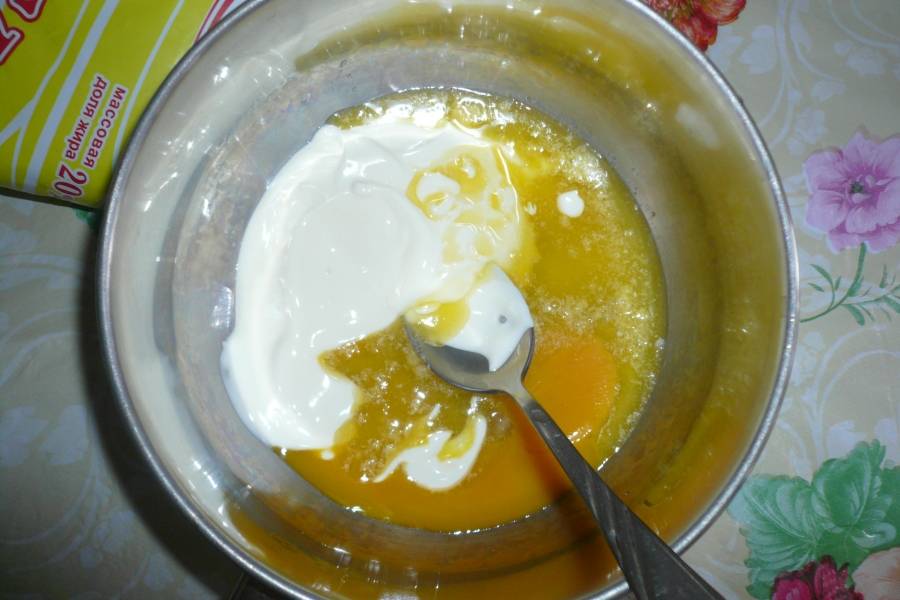 Готовим тесто: перемешиваем маргарин, желток и сметану