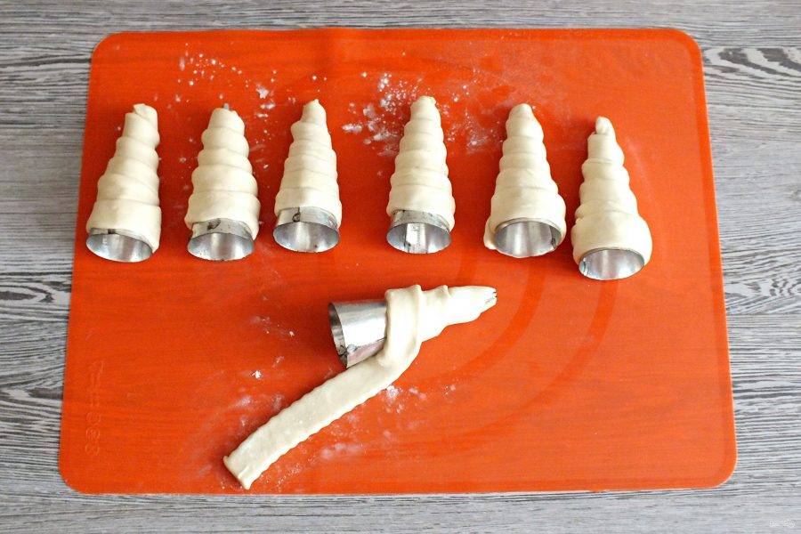 Подготовьте металлические формочки для выпекания трубочек. Смажьте тонким слоем сливочного масла. Возьмите одну полоску и оборачивайте формочку, начиная с острого угла. Оборачивая, слегка растягивайте тесто и делайте небольшой захлёст. Подобным образом закрутите остальное тесто. Оставьте пару полосок для крошки.