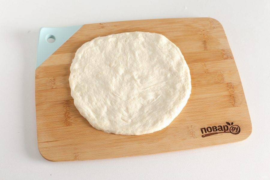 Рабочую поверхность подпылите мукой или смажьте растительным маслом. Раскатайте тесто в круглую лепёшку толщиной, примерно, 1 см. Я просто разминаю лепешки руками.