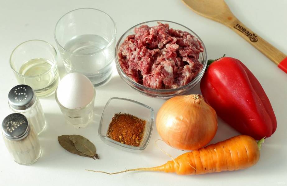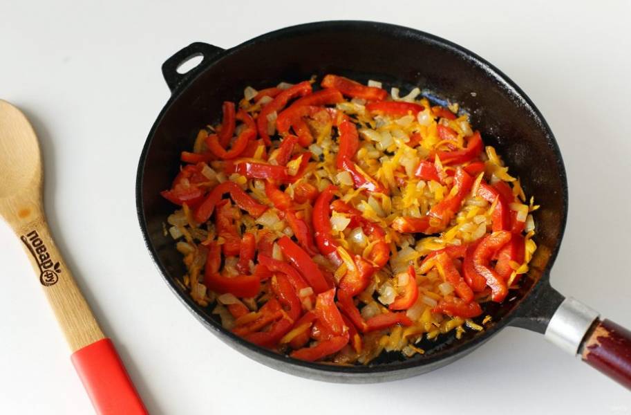 Оставшуюся луковицу нарежьте кубиками, морковь натрите на терке, а перец нарежьте небольшой соломкой. Обжарьте овощи в сковороде периодически помешивая до мягкости.