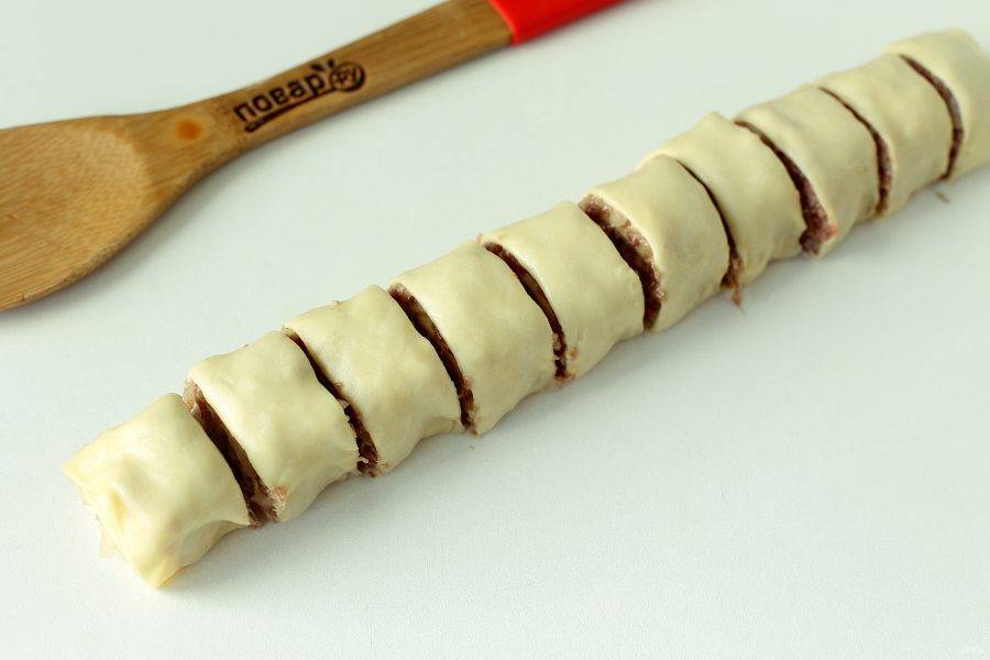 Сверните тесто с фаршем в рулет, защипните руками шов и нарежьте рулет на кусочки, шириной не более 2-3 см.
