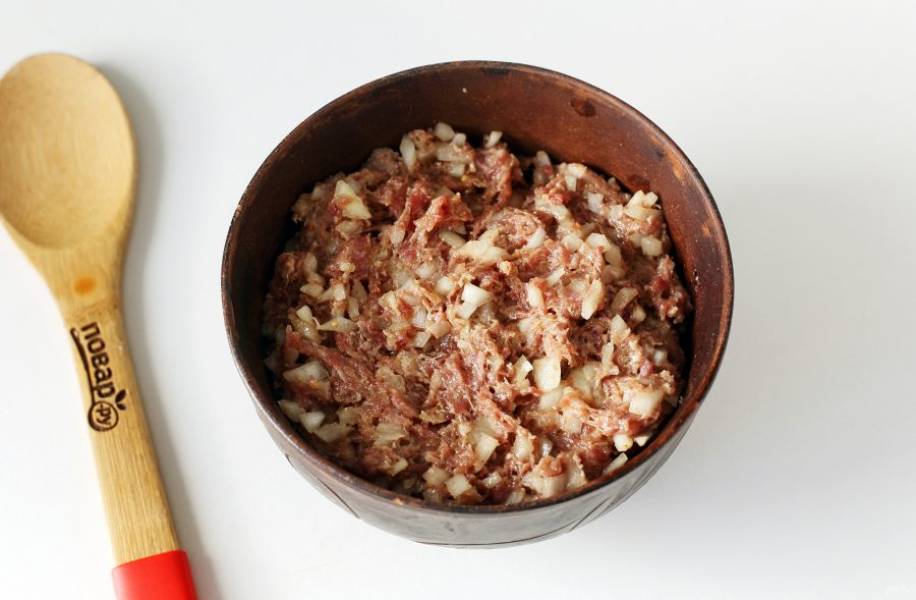 К фаршу добавьте лук, нарезанный мелкими кубиками, соль и специи по вкусу. Хорошо перемешайте. Начинка готова.