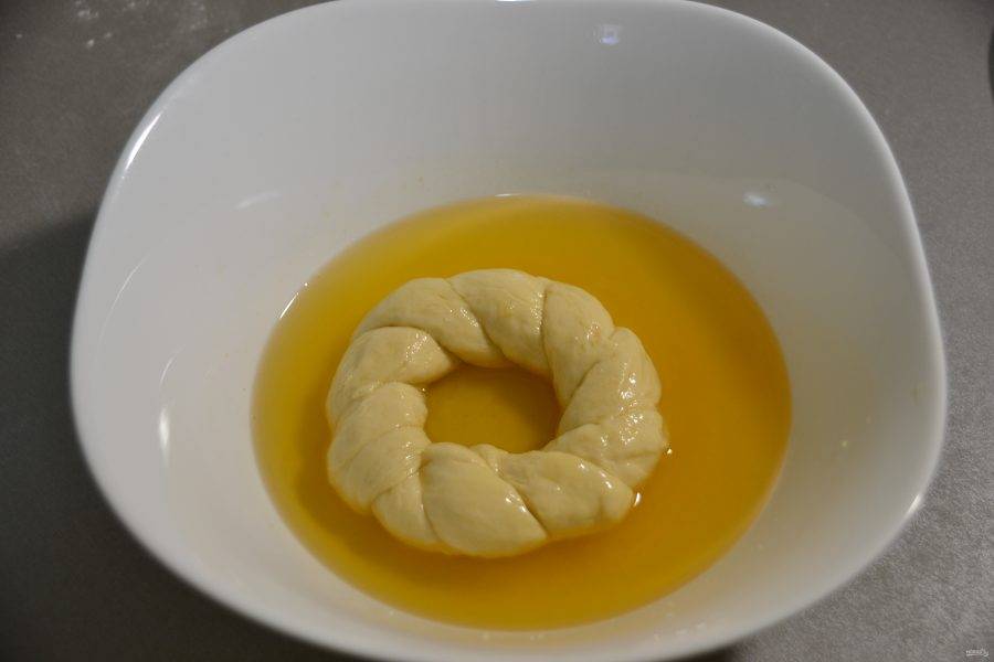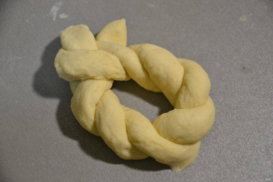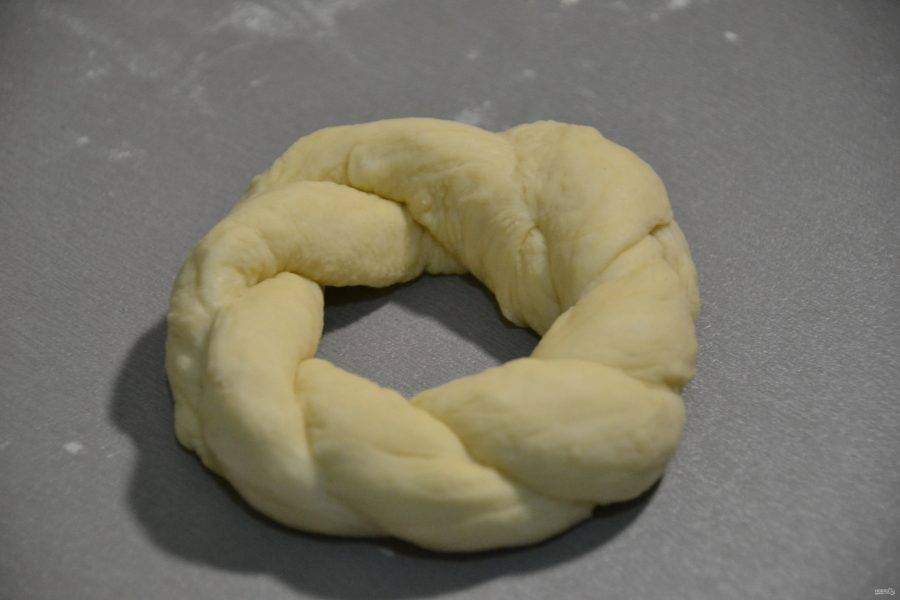 В образовавшееся отверстие просунтьте один кончик теста и скрепите его с другим концом, чтобы колечко замкнулось.
