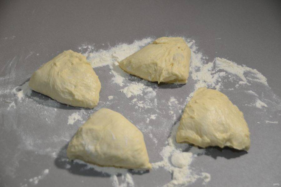 На стол, припыленный мукой, выложите тесто и разделите его на порции.