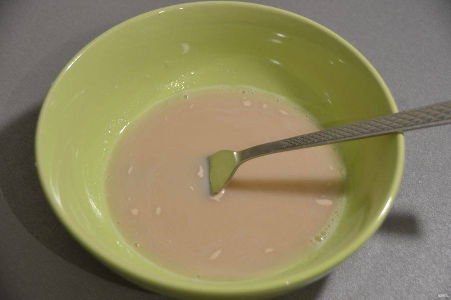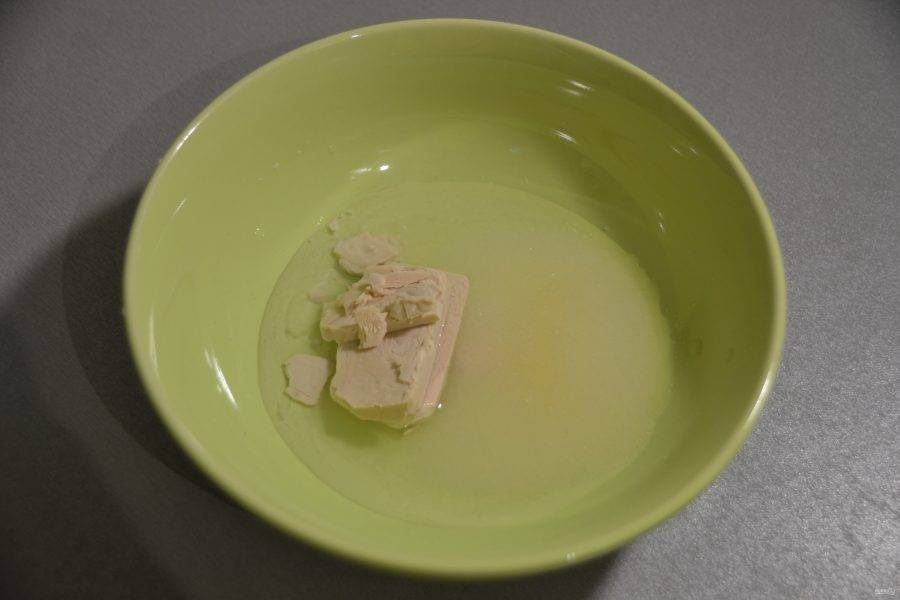 Влейте в миску 100 мл воды, положите в нее дрожжи.