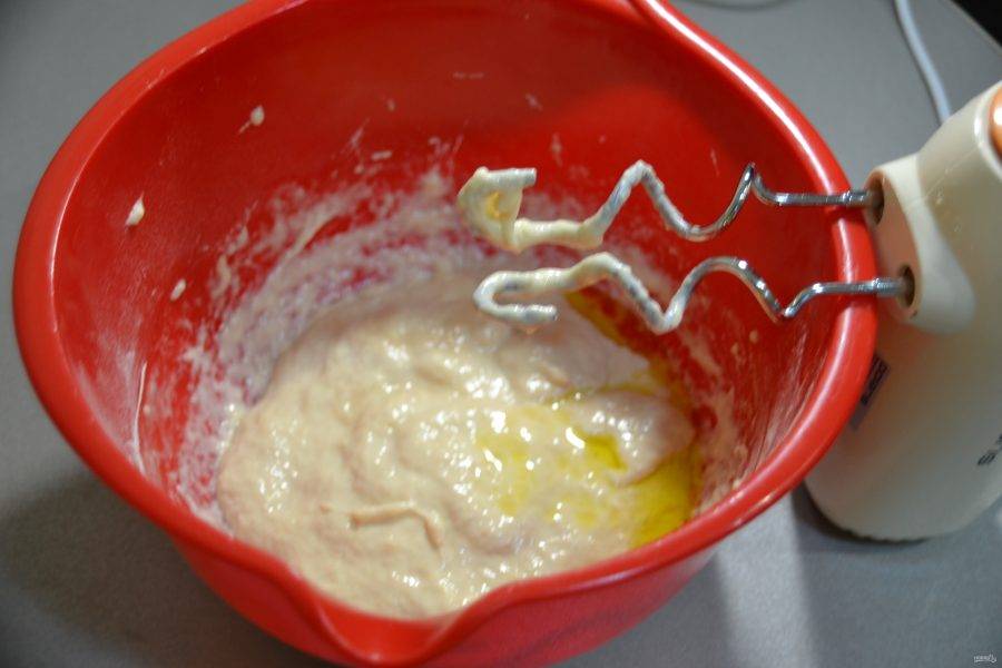 Можно вымешивать тесто миксером, в ходе вымешивания по одной столовой ложке вливайте оливковое масло.