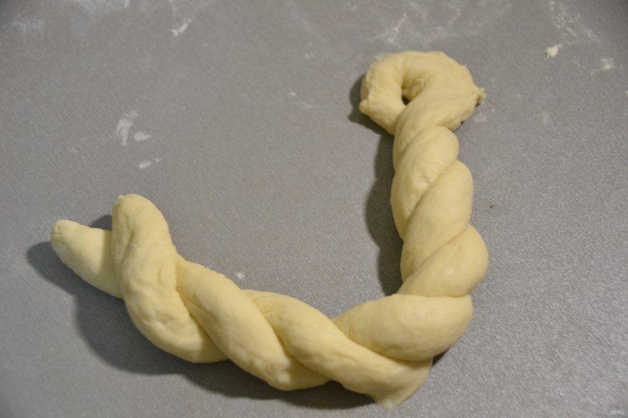 Вытянутое тесто переплетите в жгутик, оставляя небольшое отверстие в месте сгиба.