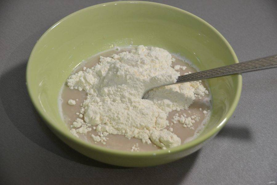 Всыпьте к дрожжам часть муки, примерно 100 г из общего количества муки.