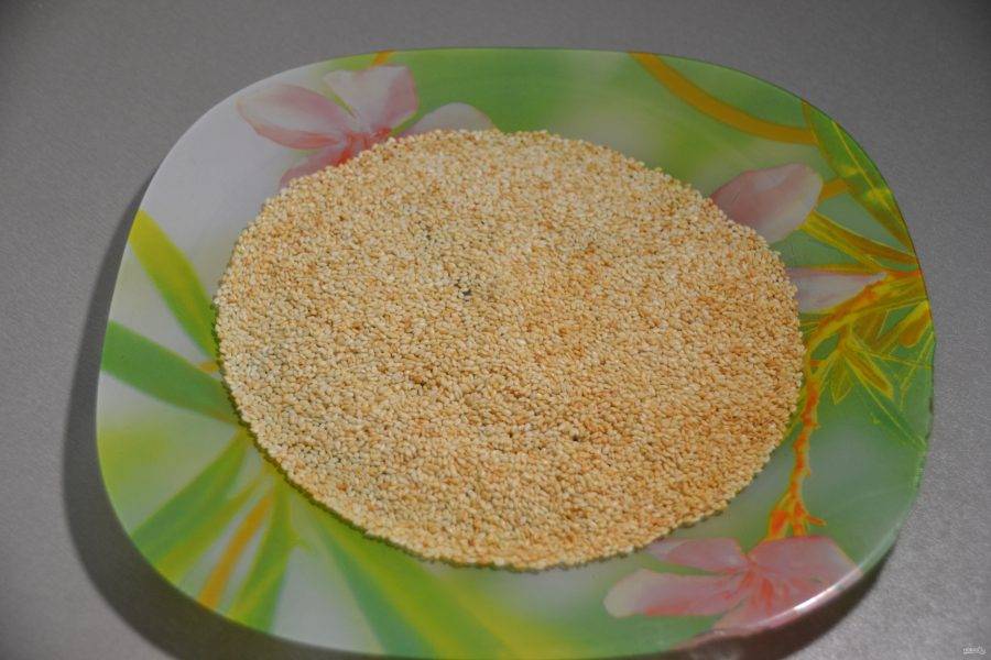 Пока тесто подходит, слегка обжарьте кунжут на сковороде без масла, на это требуется буквально 1 минута. Внимательно следите за процессом, чтобы кунжут не подгорел.
