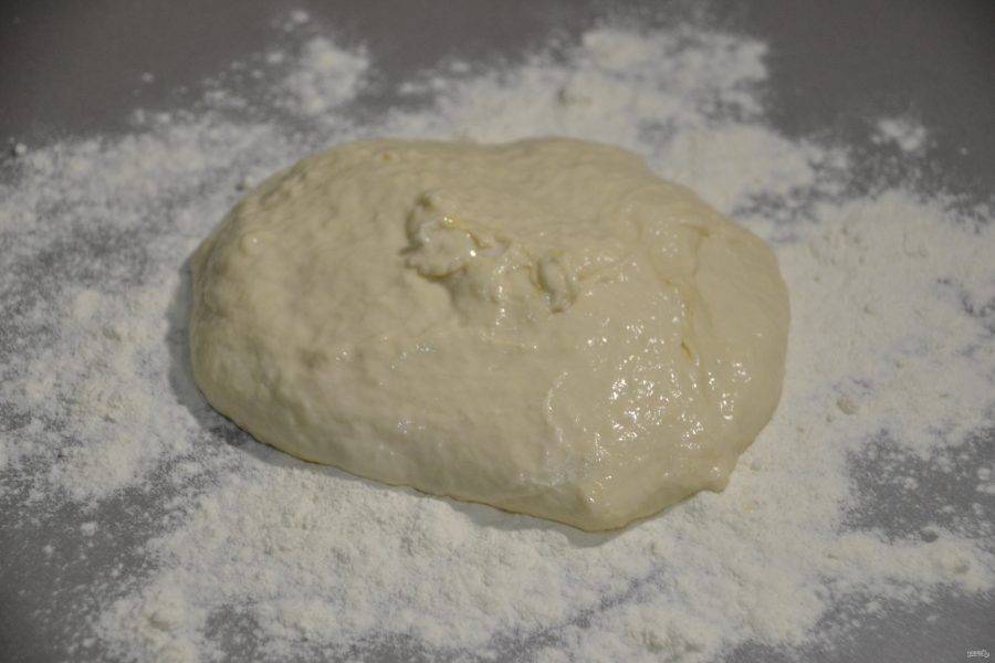 После смешивания миксером посыпьте стол мукой, дальше продолжайте вымешивать руками, пока тесто перестанет прилипать к рукам, минут 10-15.