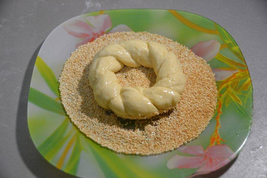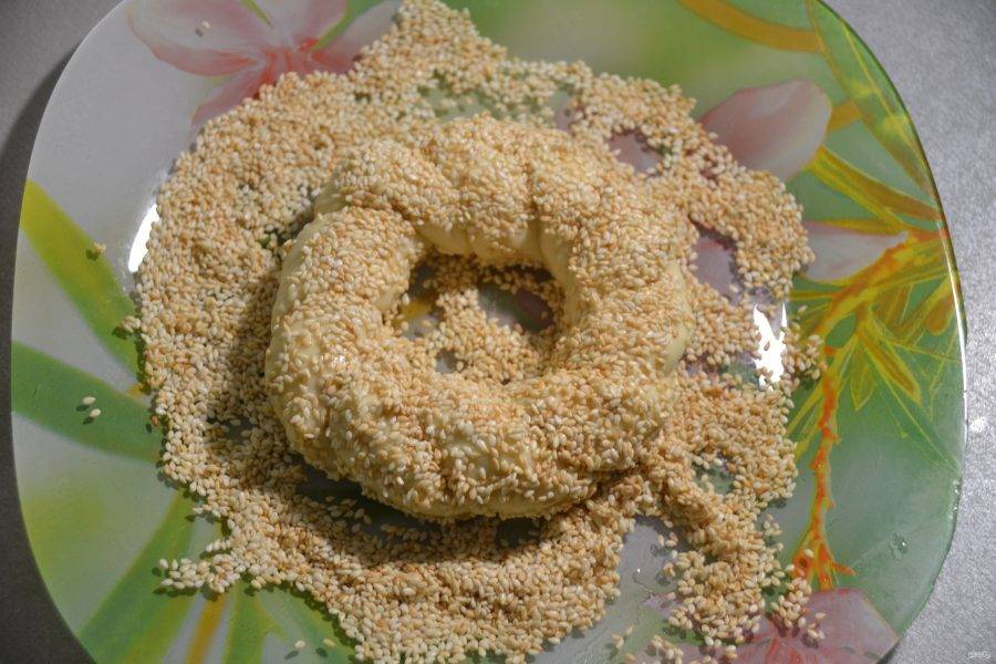 Далее обмакните бублики в кунжуте сначала с одной стороны.