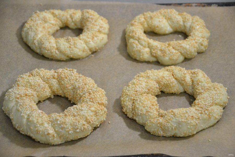 Уложите бублики на противень, застеленный бумагой для выпечки, и дайте расстояться в течение 10 минут. Пока бублики стоят на расстойке, разогрейте духовку до температуры 250 градусов.