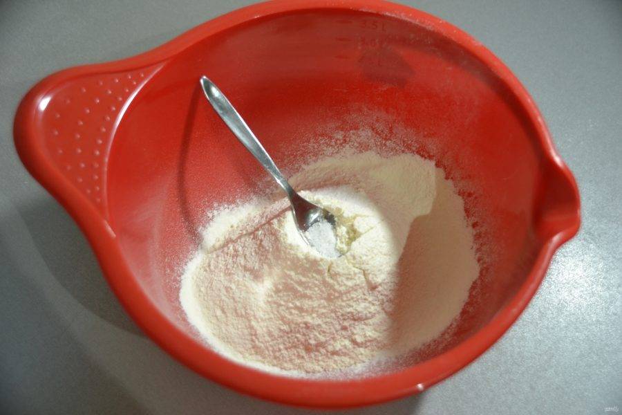 В миску для замеса теста просейте оставшуюся муку, добавьте соль и перемешайте.