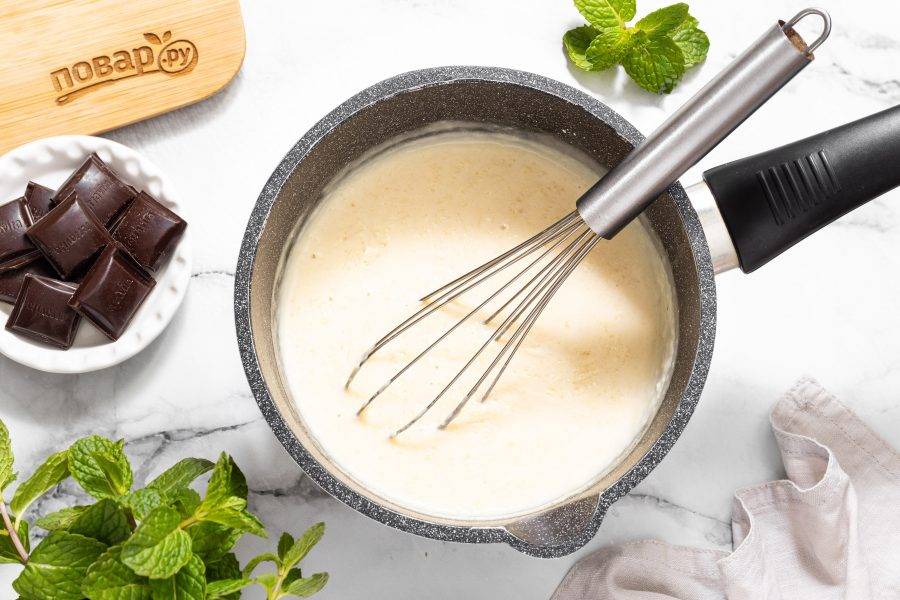 Доведите до кипения. На среднем огне проварите до появление первых пузырьков, помешивая смесь венчиком.