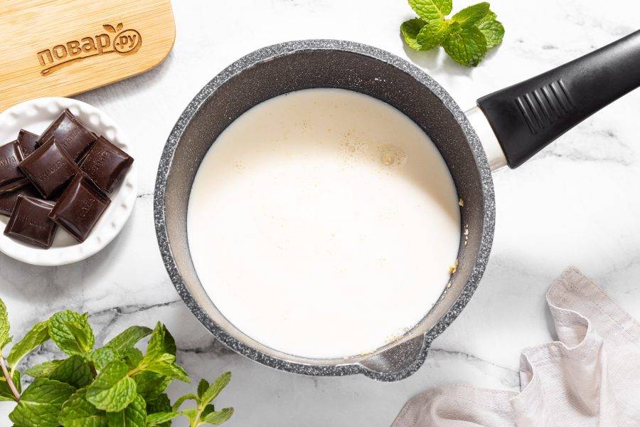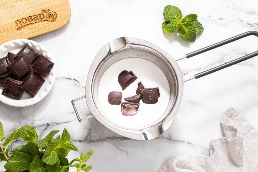 Для шоколадного слоя подогрейте сливки и добавьте шоколад. Растопите и перемешайте до однородности.