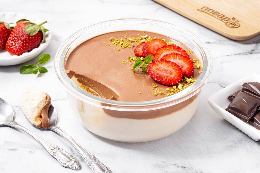 Полейте десерт растопленным шоколадом со сливками. Снова уберите в холодильник на пару часов, а лучше на ночь.