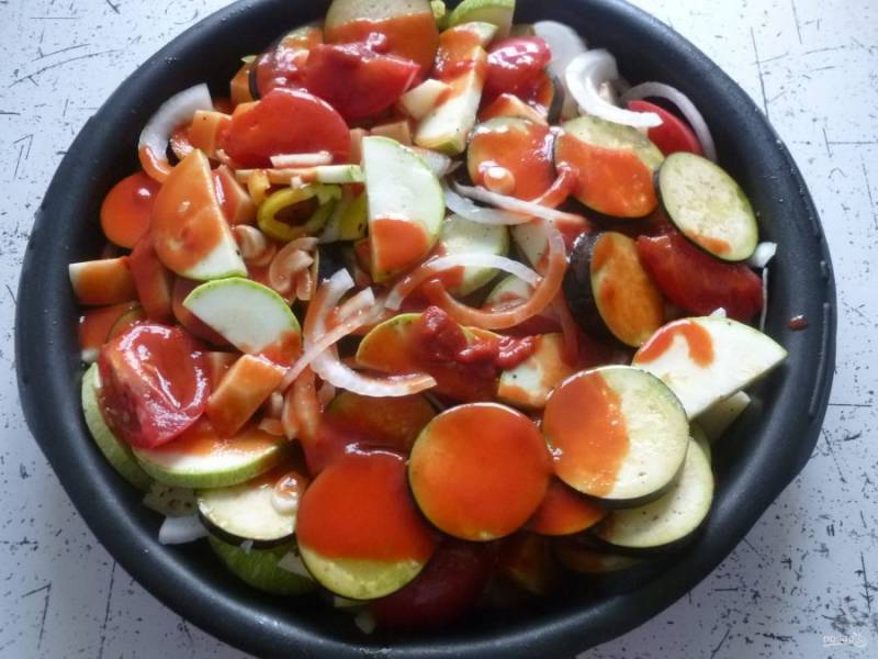 Томатную пасту разведите стаканом кипятка, залейте овощи. Полейте овощи оливковым маслом и поставьте в духовку (180°) на 1,5 часа.