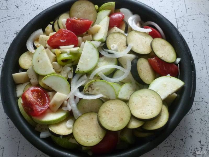 Возьмите большую форму для запекания, выложите подготовленные овощи, приправьте солью и перцем по вкусу. Добавьте орегано и перемешайте.