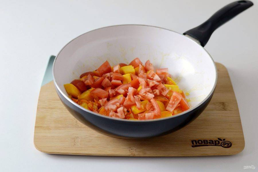 Затем добавьте нарезанные кубиками томаты, посолите и поперчите. Готовьте еще 10 минут под крышкой на среднем огне.