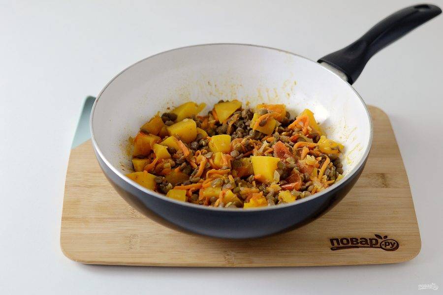 После добавьте чечевицу, перемешайте. Готовьте блюдо еще 3-4 минуты.
