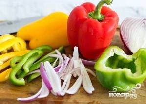 Лук нарежьте соломкой, из перцев удалите сердцевину, промойте их и нарежьте полосками. Помидоры нарежьте кубиками, чеснок мелко порубите острым ножом.
