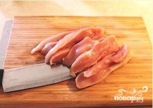 Куриную грудку промойте и обсушите. Нарежьте филе тонкими полосками.