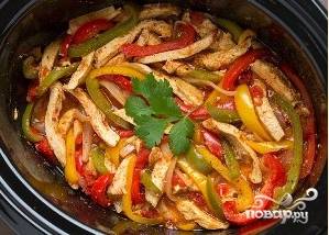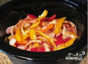 Кусочки курочки посыпьте молотым перцем и солью и выложите поверх овощей. Овощи с грудкой тушите с накрытой крышкой в режиме медленной варки. Процесс будет занимать 3-4 часа в высоком регистре. За час до конца готовки добавьте лимонный сок и мед, все хорошо перемешайте.