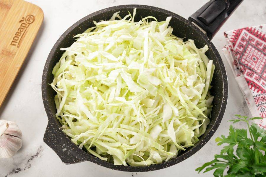 Капусту нашинкуйте соломкой и переложите в разогретую сковороду с маслом.