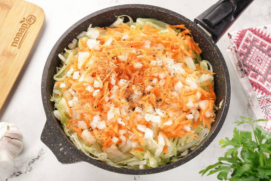 Затем добавьте тёртую морковь и нарезанный кубиками лук. Посолите и поперчите по вкусу. Можно добавить любимые специи.