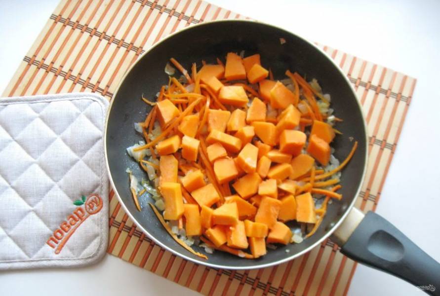 Тыкву очистите, помойте и нарежьте небольшими кубиками. Выложите в сковороду. Тушите с луком, чесноком и морковью 5-7 минут.