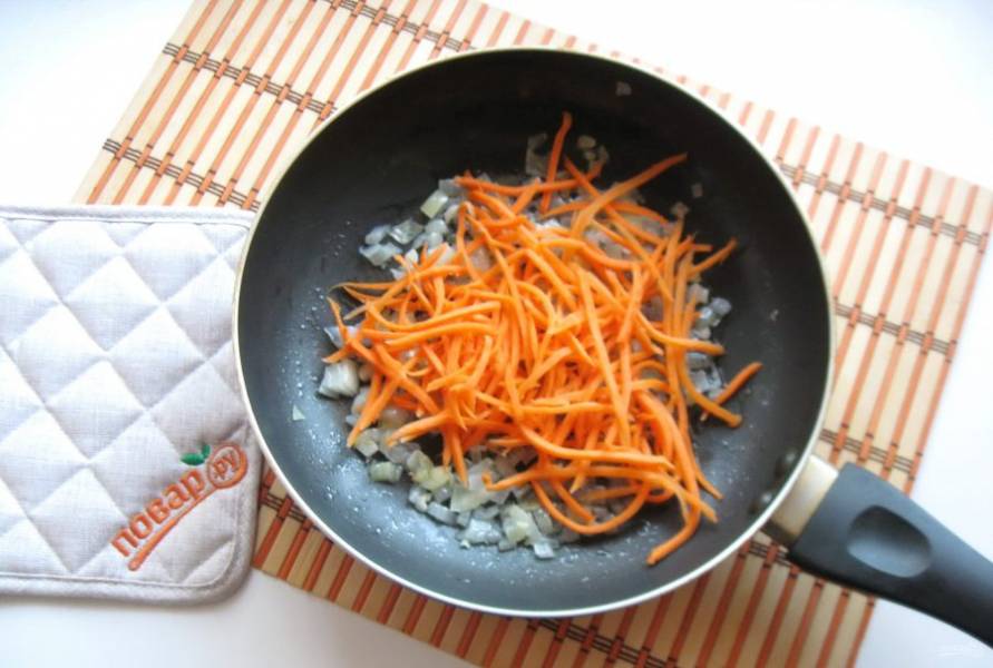 Морковь очистите, помойте и натрите на терке, я взяла терку для корейской моркови. Добавьте в сковороду к луку и чесноку.